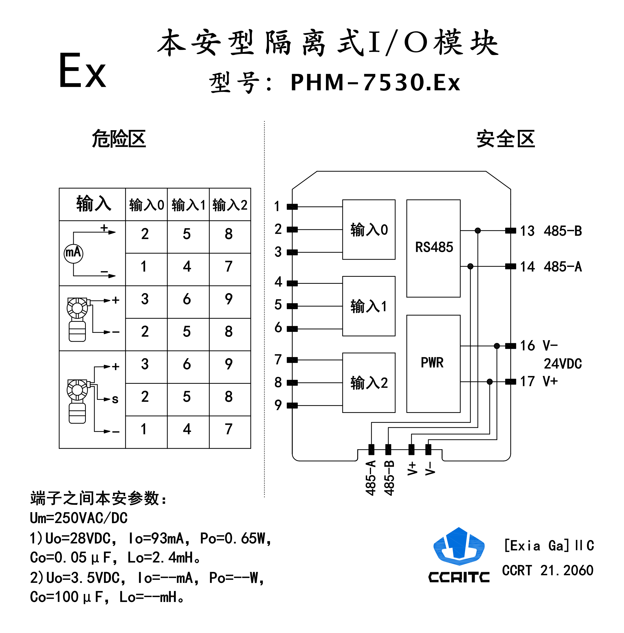 端子1-2,4-5,7-8之間:Um=250V Uo=10.5V lo=15mA Co=1.7uF Lo=100mH Po=39.4mW 端子2-3,5-6,8-9之間:Um=25 0V Uo=28V lo=93mA Co=0.05uF Lo=2.4mH Po=0.65W |