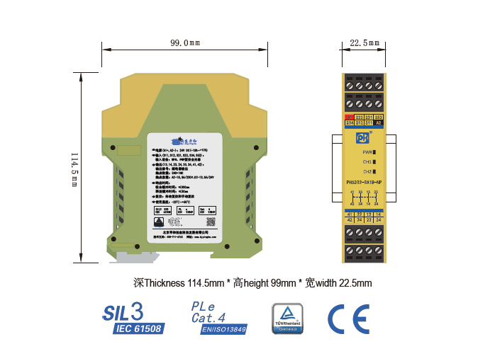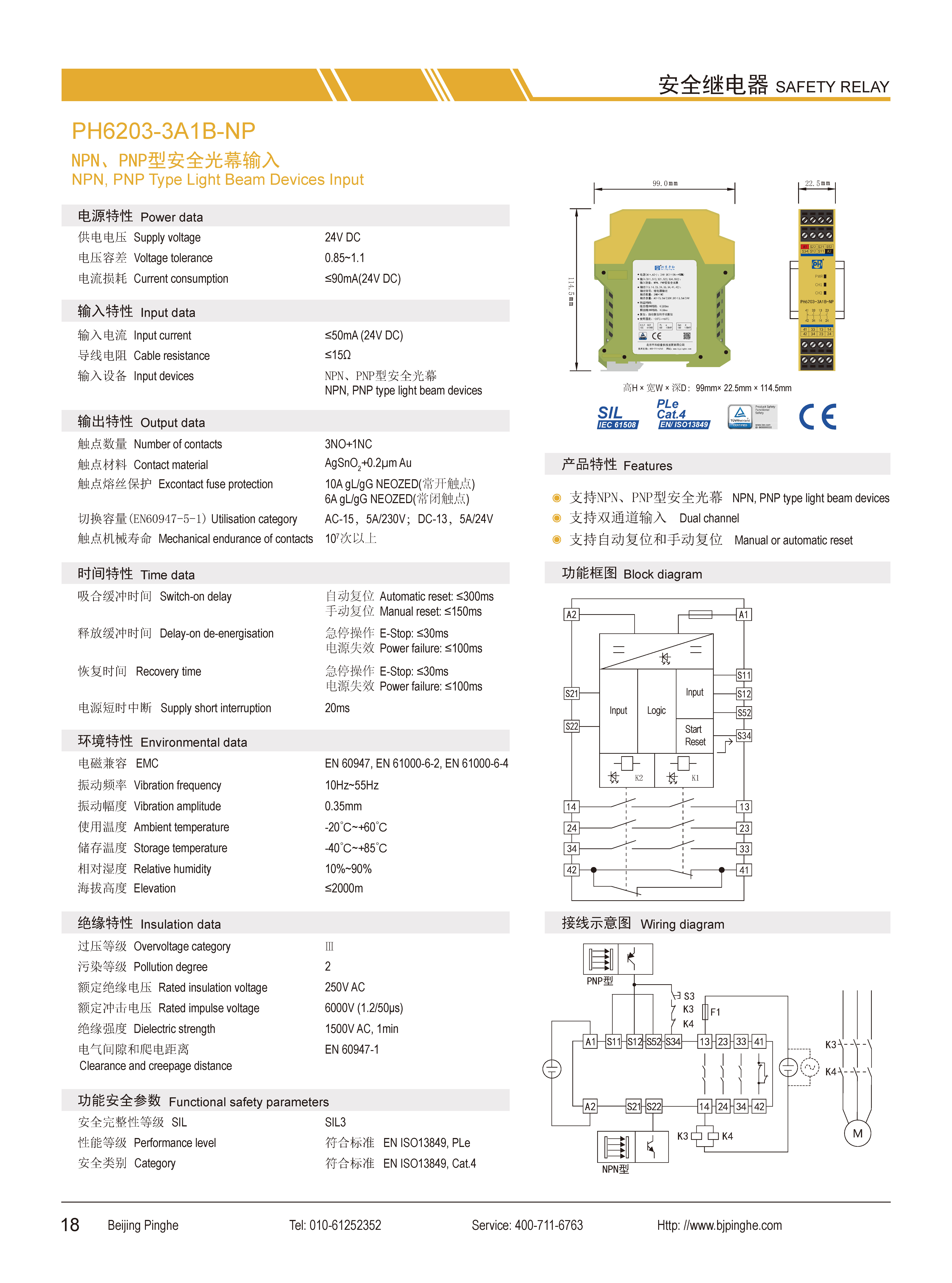 PH6203-3A1B-NP是一款安全繼電器控制模塊,適用于NPN、PNP型安全光幕輸入,具有3路常開(NO)安全輸出觸點(diǎn)和1路常閉(NC)輔助輸出觸點(diǎn)的安全繼電器。它支持雙通道操作,可選擇手動(dòng)或自動(dòng)復(fù)位。