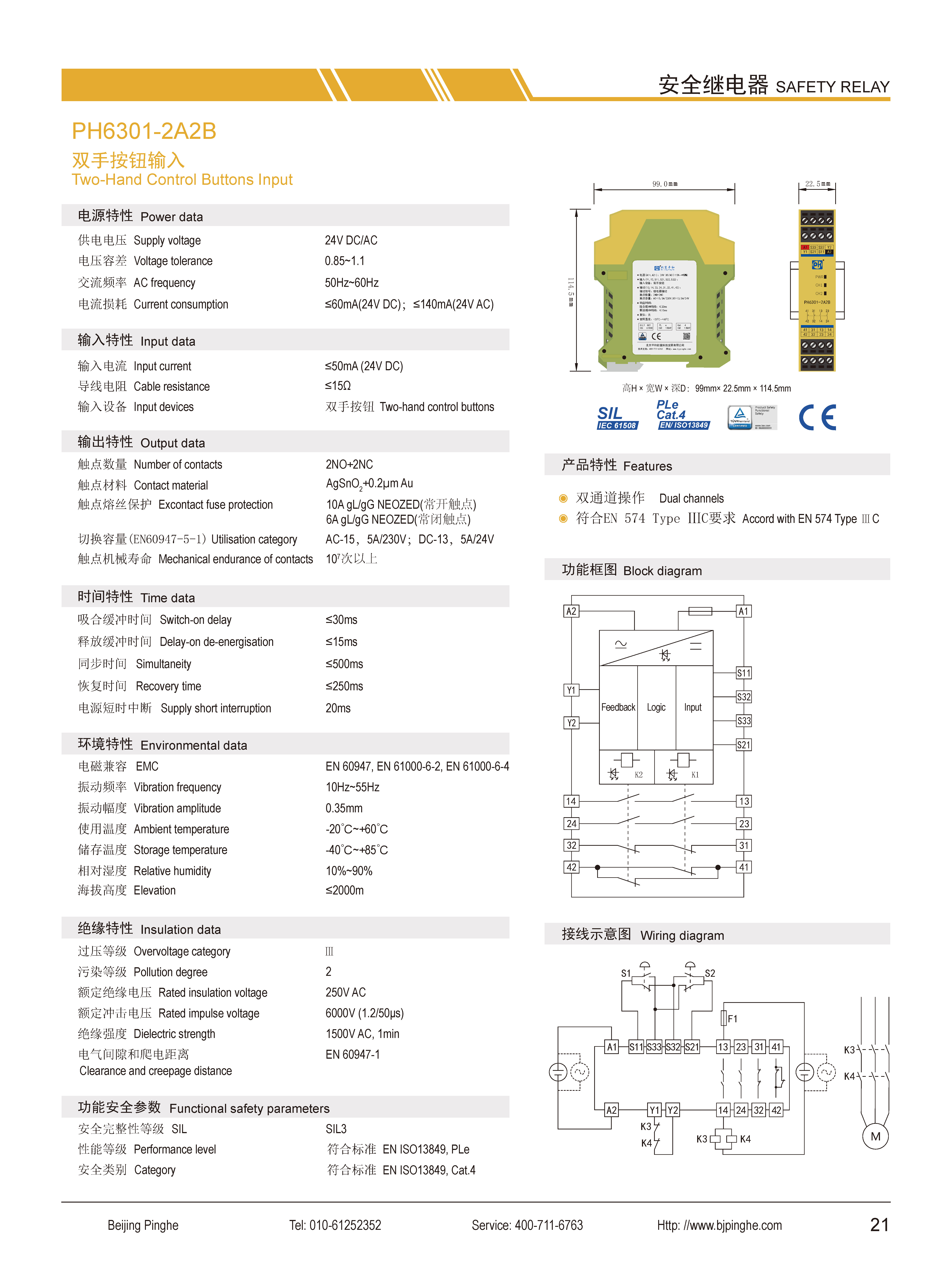 PH6301-2A2B是一款安全繼電器控制模塊,適用于雙手按鈕輸入,具有2路常開(NO)安全輸出觸點和2路常閉(NC)輔助輸出觸點的安全繼電器。它具有雙通道輸入模式,自動復位,并具有不超過0.5s的同步檢測功能。