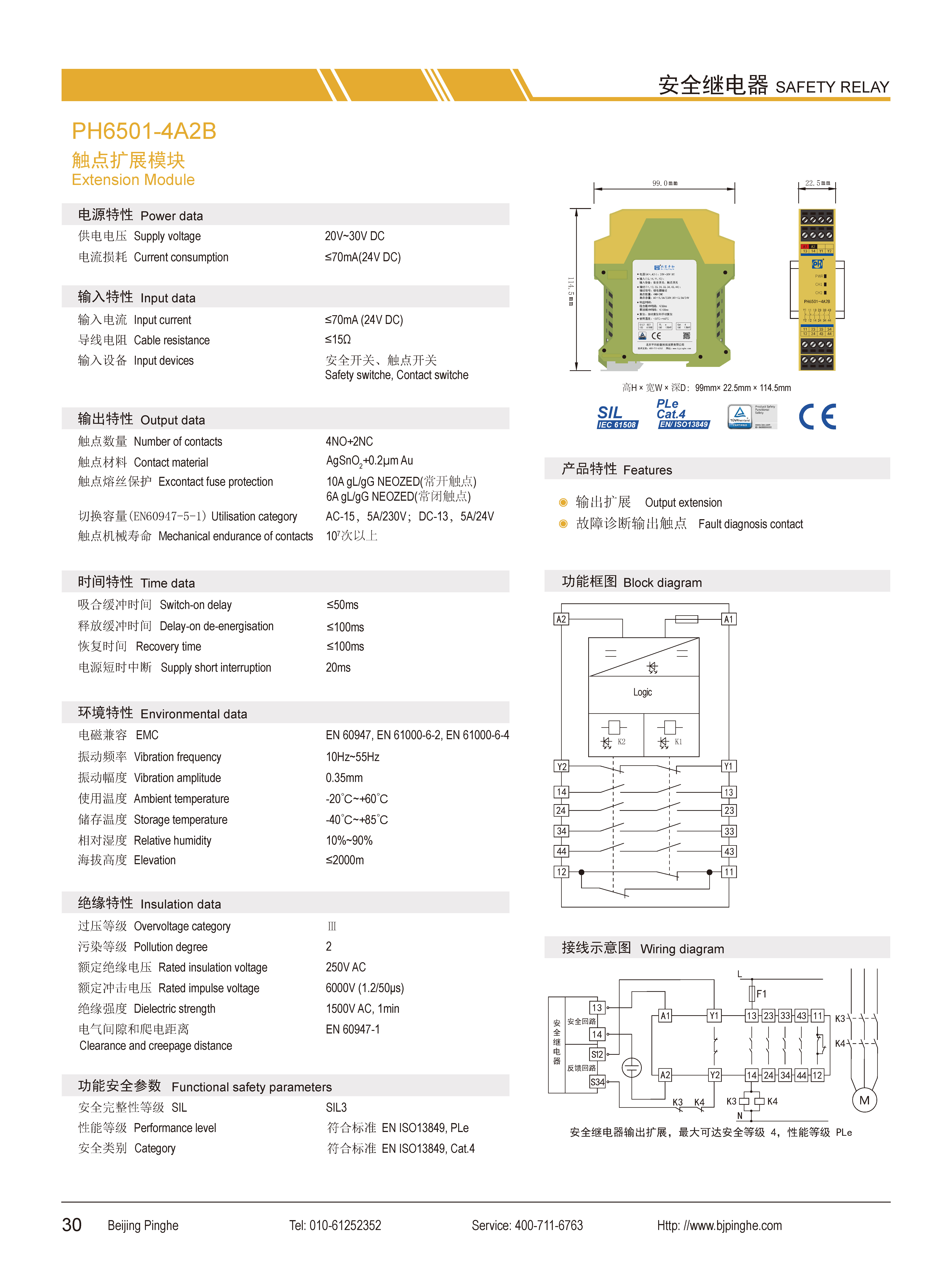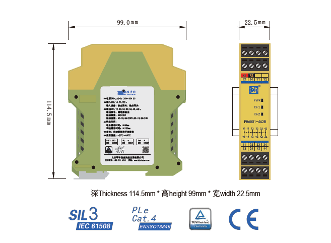 PH6501-4A2B是一款安全繼電器輸出擴(kuò)展模塊,它接收現(xiàn)場的安全開關(guān)信號,并擴(kuò)展為4路常開(NO)安全輸出觸點(diǎn)和2路常閉(NC)輔助輸出觸點(diǎn),2路輔助觸點(diǎn)可分別用于輸出狀態(tài)指示及故障反饋。