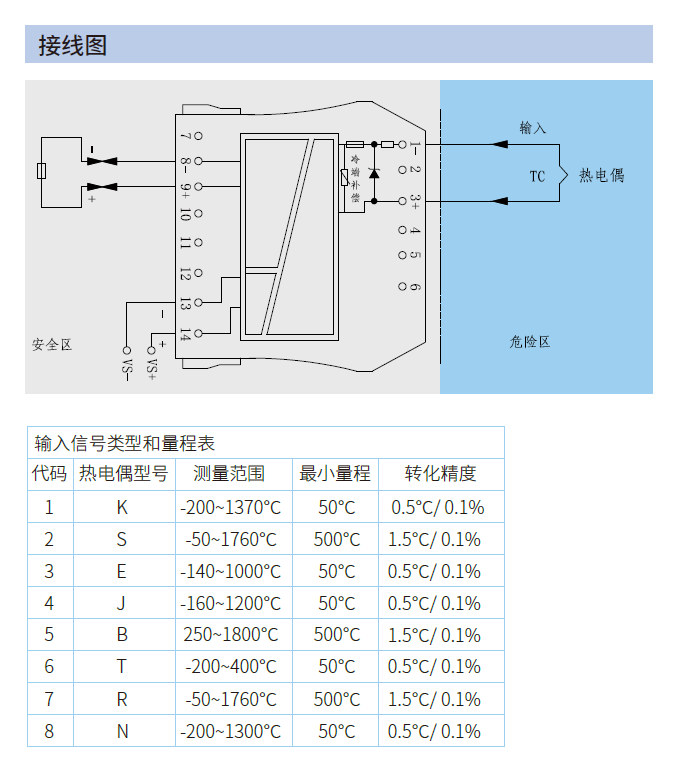 (TC)轉(zhuǎn)換為4~20mA電流信號(hào),用于驅(qū)動(dòng)安全區(qū)域負(fù)載。此產(chǎn)品內(nèi)置冷端補(bǔ)償功能,可智能