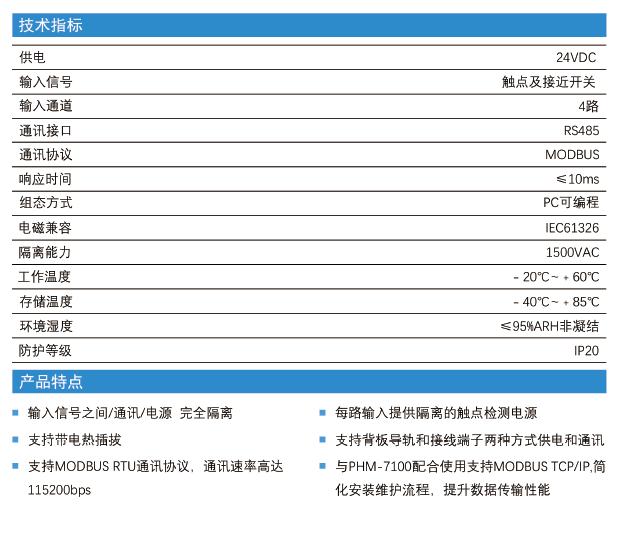 將工業(yè)現(xiàn)場的4路開關(guān)量分別隔離轉(zhuǎn)換為數(shù)字信號,按照MODBUS規(guī)約,通過RS485通訊方式,將數(shù)字信號提供給PHM-7100,PLC或上位機(jī)等控制器或數(shù)據(jù)采集系統(tǒng)。完善的隔離設(shè)計理念非常適合工業(yè)現(xiàn)場的復(fù)雜工況,長期穩(wěn)定性好,每路提供隔離的觸點檢測電源,增加了觸點檢測的可靠性、抗干擾性能優(yōu)異。