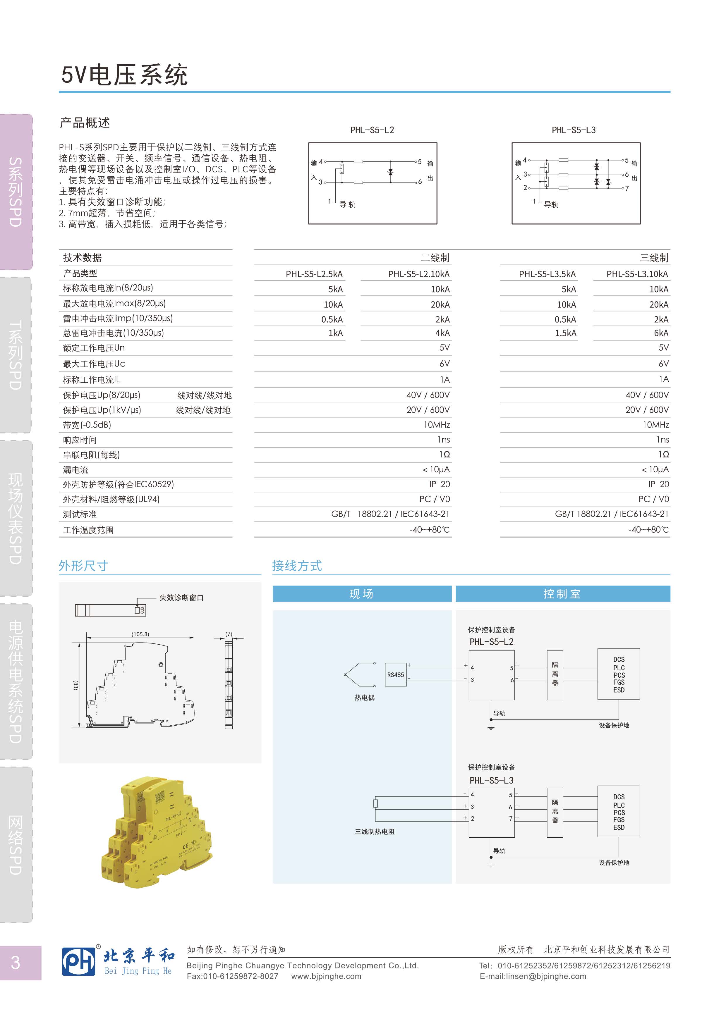 PHL-S系列SPD主要用于保護以二線制、三線制方式連接的變送茶、開關,題率信號、通信設備、熱電阻、熱電偶等現(xiàn)場設備以及控制室IO.DCs、PLC等設備使其免受雷擊電涌沖擊電壓或操作過電壓的損害。主要特點有: