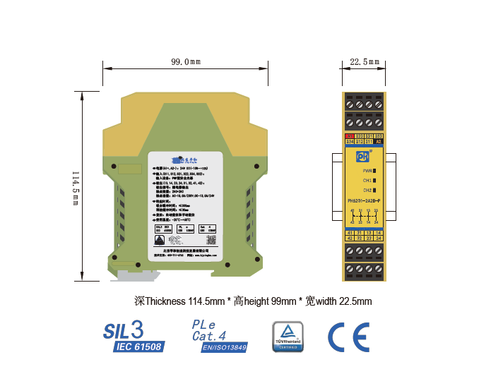 PH6201-2A2B-P是一款安全繼電器控制模塊,適用于PNP型安全光幕輸入,具有2路常開(NO)安全輸出觸點和2路常閉(NC)輔助輸出觸點的安全繼電器。它支持單、雙通道操作,手動或自動復位,并具有通道間短路監(jiān)控功能。