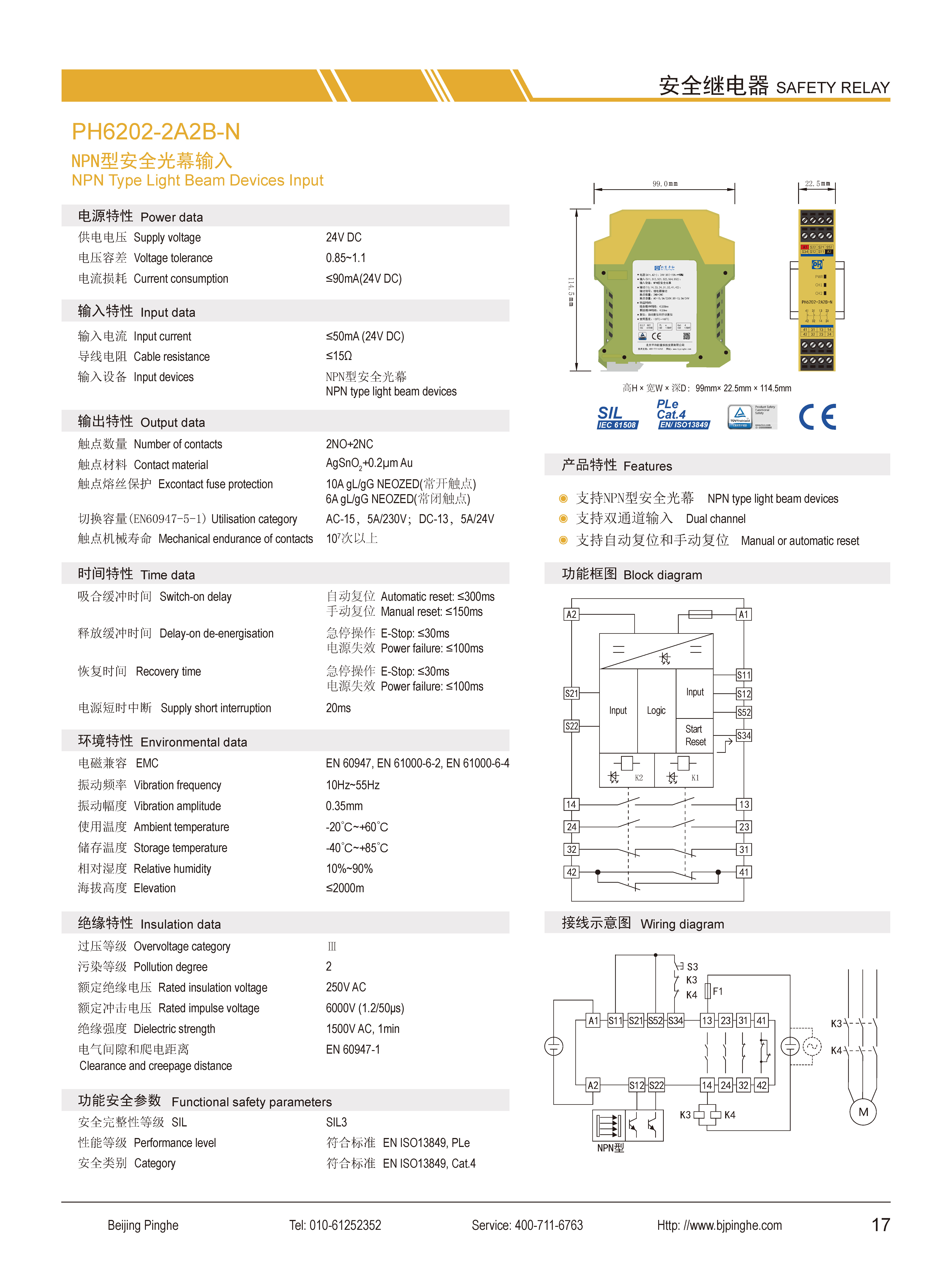 PH6202-2A2B-N是一款安全繼電器控制模塊,適用于NPN型安全光幕輸入,具有2路常開(kāi)(NO)安全輸出觸點(diǎn)和2路常閉(NC)輔助輸出觸點(diǎn)的安全繼電器。它支持雙通道操作,可選擇手動(dòng)或自動(dòng)復(fù)位。