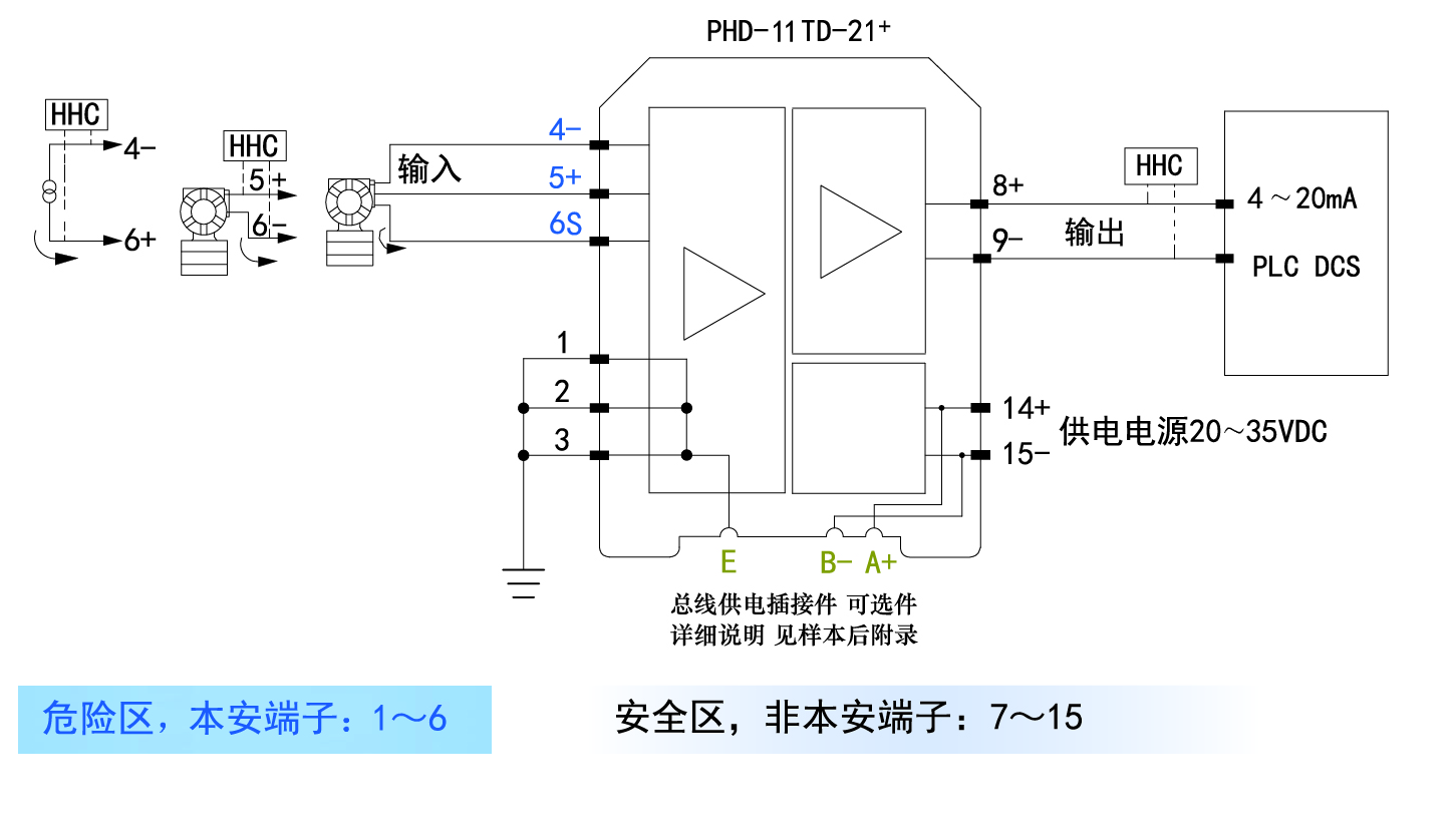 電涌保護(hù)型模擬量輸入隔離式安全柵, 為危險(xiǎn)區(qū)域的二、三線(xiàn)制變送器或電流源提供隔離供電,變送器或電流源產(chǎn)生的4~20mA信號(hào),從危險(xiǎn)區(qū)傳送到安全區(qū)輸出,從而驅(qū)動(dòng)安全區(qū)域的負(fù)載。對(duì)于二、三線(xiàn)制變送器或電流源信號(hào),該安全柵支持疊加到4~20mA信號(hào)上的HART數(shù)字信號(hào)雙向通訊,并具有斷線(xiàn)報(bào)警功能。