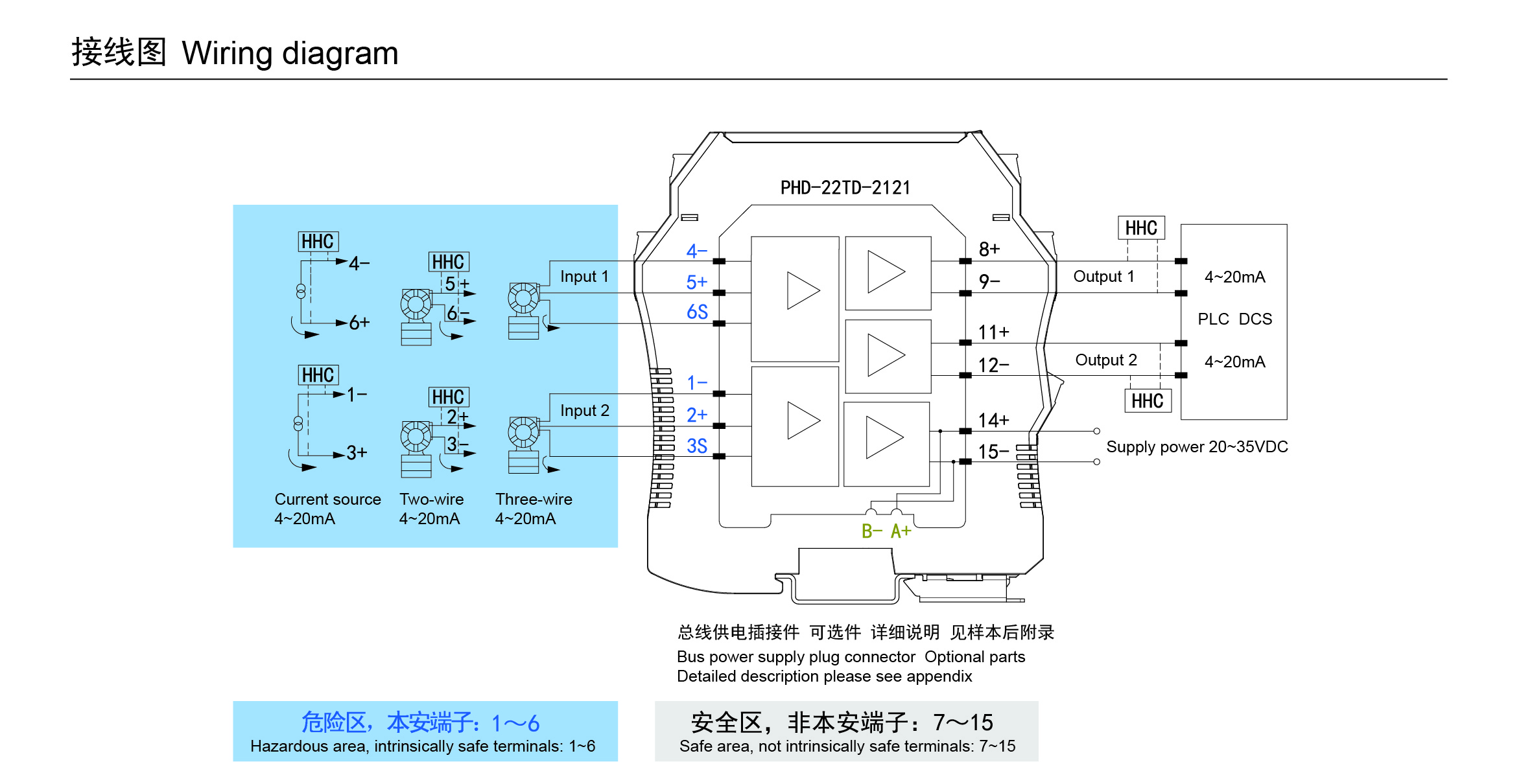 模擬量輸入隔離式安全柵, 為危險(xiǎn)區(qū)域的二、三線制變送器提供隔離供電,變送器或電流源產(chǎn)生的4~20mA信號(hào),從危險(xiǎn)區(qū)傳送到安全區(qū)輸出,從而驅(qū)動(dòng)安全區(qū)域的負(fù)載。對(duì)于二、三線制變送器或電流源信號(hào),該安全柵支持疊加到4~20mA信號(hào)上的HART數(shù)字信號(hào)雙向通訊,并具有斷線報(bào)警功能。