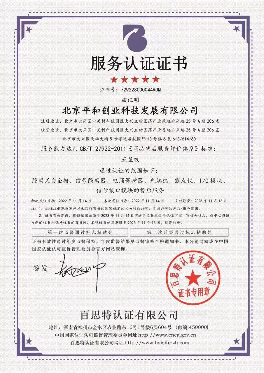 此次北京平和獲得《商品售后服務(wù)評價體系》標(biāo)準(zhǔn)五星級認(rèn)證證書,是繼獲得ISO9001質(zhì)量管理體系認(rèn)證證書、ISO14001《環(huán)境管理體系認(rèn)證證書》和ISO45001《職業(yè)健康安全管理體系認(rèn)證證書》等,取得的又一企業(yè)資質(zhì)管理榮譽認(rèn)證證書。