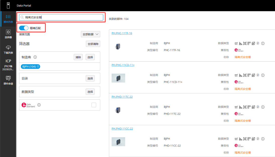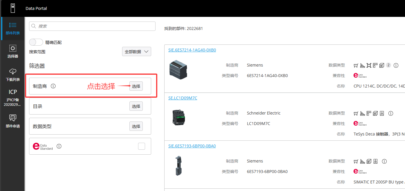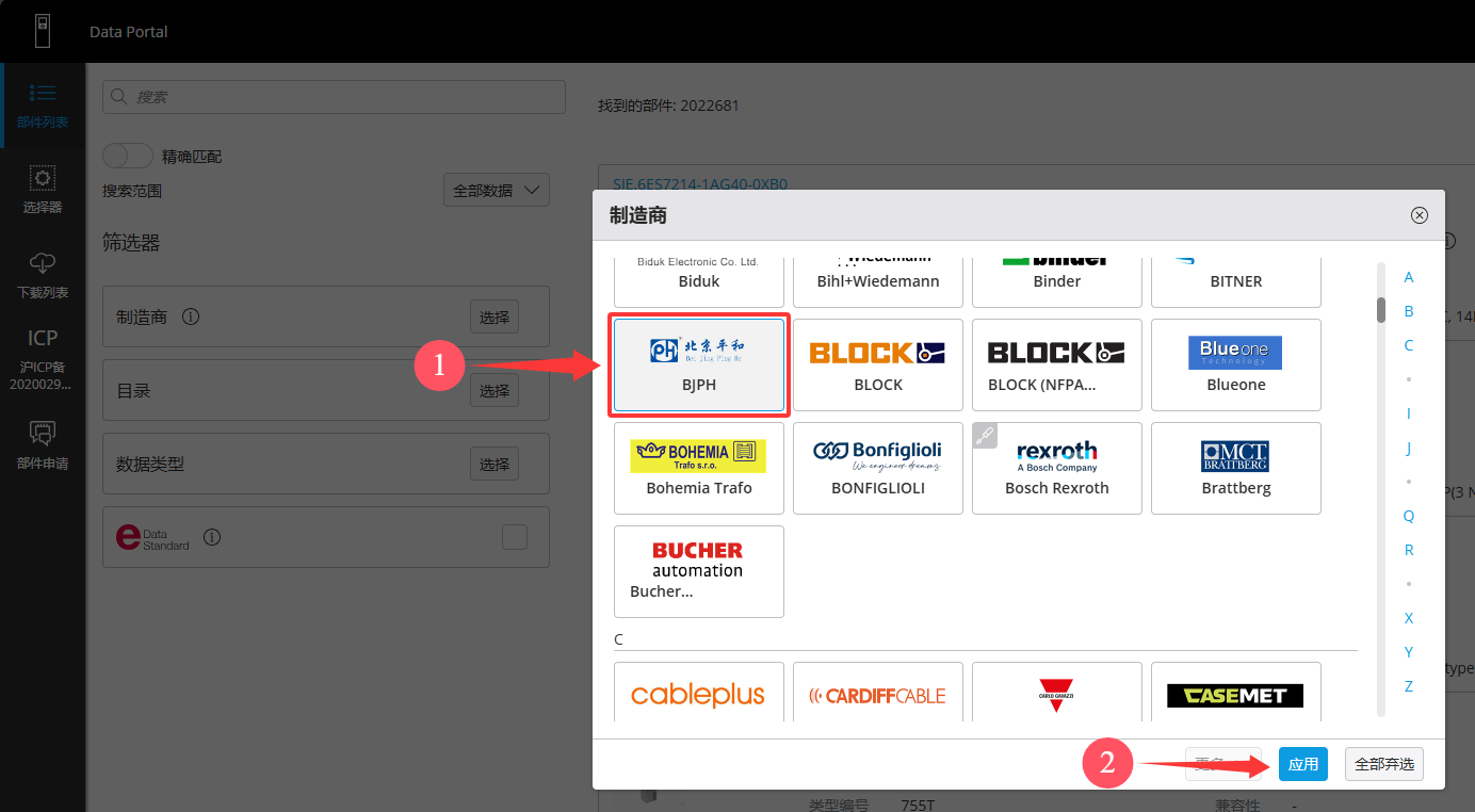 在Eplan Data Portal平臺中,點擊制造商選擇按鈕,選擇北京平和logo,點擊應用。