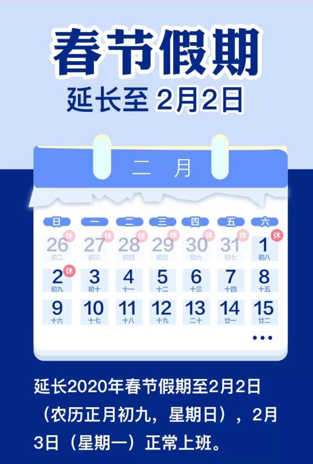 由于受到新型冠狀病毒疫情影響,為保障我司正常上班時(shí)車間物料能正常供應(yīng),根據(jù)國(guó)務(wù)院最新通知安排,延長(zhǎng)2020年春節(jié)假期至2月2日(農(nóng)歷正月初九,星期日),2月3日(星期一)起正常上班。