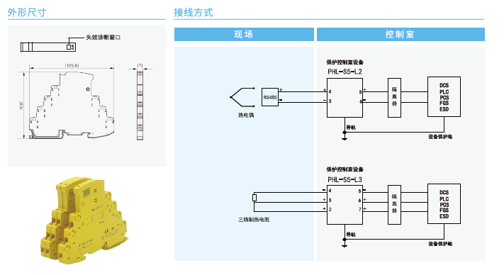 PHL-S系列SPD主要用于保護以二線制、三線制方式連接的變送茶、開關,題率信號、通信設備、熱電阻、熱電偶等現(xiàn)場設備以及控制室IO.DCs、PLC等設備使其免受雷擊電涌沖擊電壓或操作過電壓的損害。主要特點有: